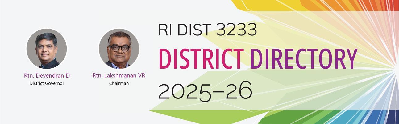 The District Directory 2025–26 is a comprehensive resource showcasing the leaders, clubs, and initiatives of RI District 3233. It reflects our unity, diversity, and commitment to ‘Unite for Good,’ offering Rotarians essential contacts, guidance, and inspiration for impactful service throughout the year